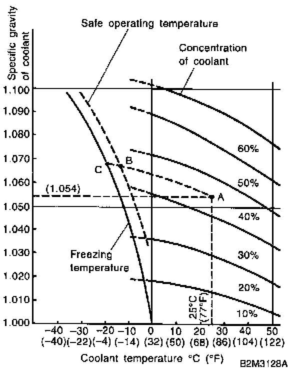 If the coolant temperature is 25°C (77°F) and its specific gravity is 1.054, the concentration is 35% (point A), the safe operating temperature is -14°C (7°F) (point B), and the freezing temperature is -20°C (-4°F) (point C).