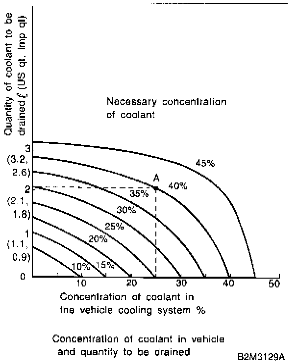 Assume that the coolant concentration must be increased form 25% to 40%. Find point A, where the 25% line of coolant concentration intersects with the 40% curve of the necessary coolant concentration, and read the scale on the vertical axis of the graph at height A. The quantity of coolant to be drained is 2.1 liters (2.2 US qt. 1.8 Imp qt). Drain 2.1 liters (2.2 US qt. 1.8 Imp qt) of coolant from the cooling system and add 2.1 liters (2.2 US qt. 1.8 Imp qt) of the undiluted solution of SUBARU coolant.