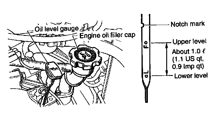 6. Just after driving or while the engine is warm, engine oil level may show in the range between the "F" line and the notch mark. This is caused by thermal expansion of the engine oil.