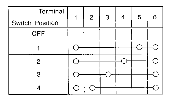 3. Symbol in the table indicates that continuity exists between two points or terminals. For example, when a switch position is "3", continuity exists among terminals 1, 3 and 6, as shown in table.