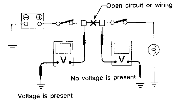 An open circuit is determined by measuring the voltage between respective connectors and ground using a voltmeter, starting with the connector closest to the power supply. The power supply must be turned ON so that current flows in the circuit. If voltage is not present between a particular connector and ground, the circuit between that connector and the previous connector is open.