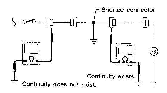 Disconnect all affected connectors, and check continuity between each connector and ground. When ohmmeter indicates continuity between a particular connector and ground, that connector is shorted.