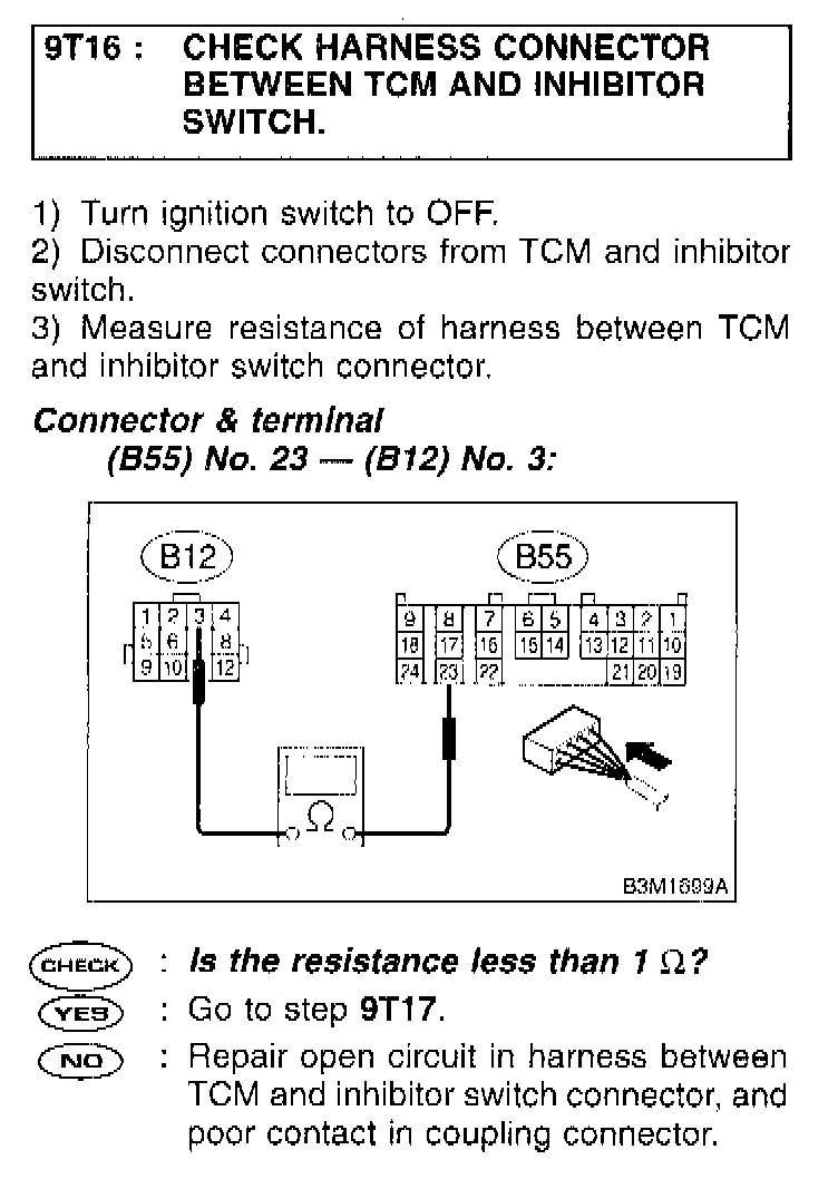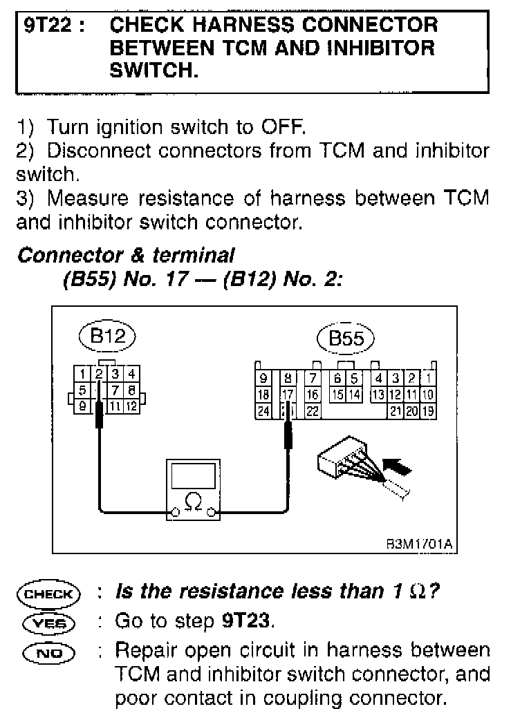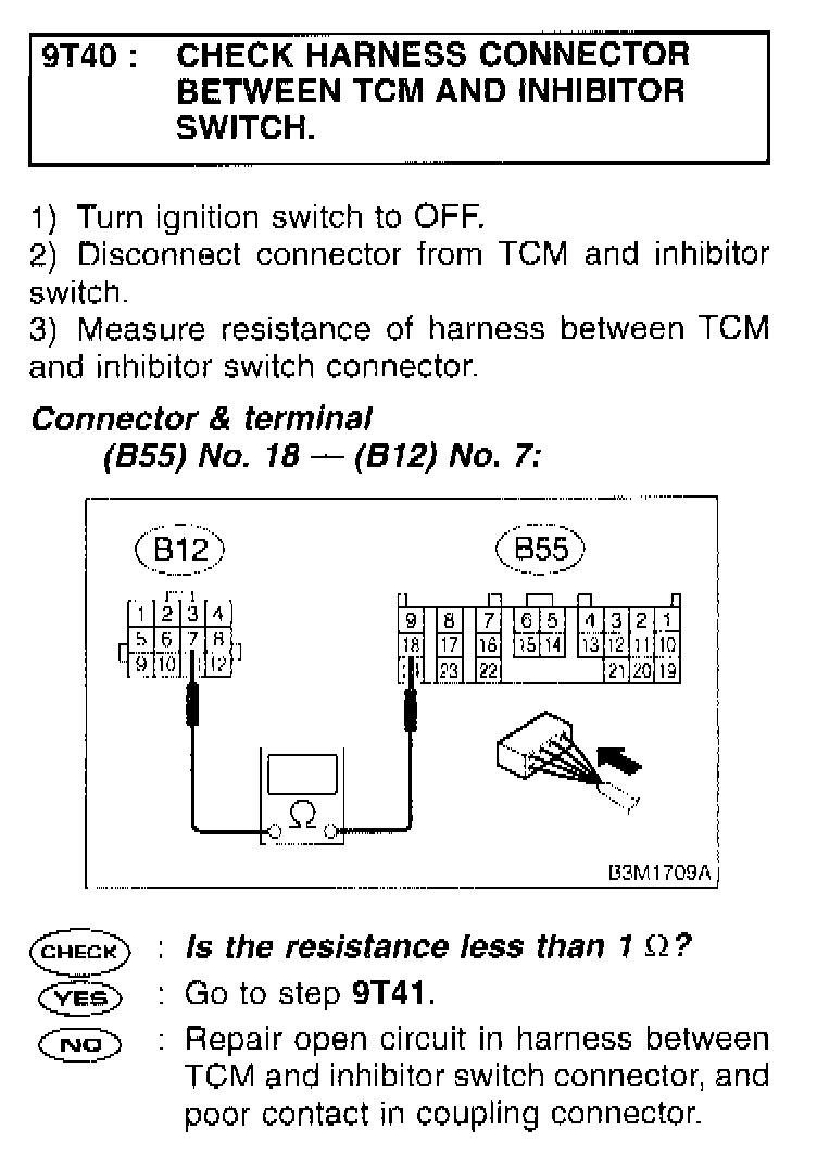 9T22: CHECK HARNESS CONNECTOR BETWEEN TCM AND INHIBITOR SWITCH.