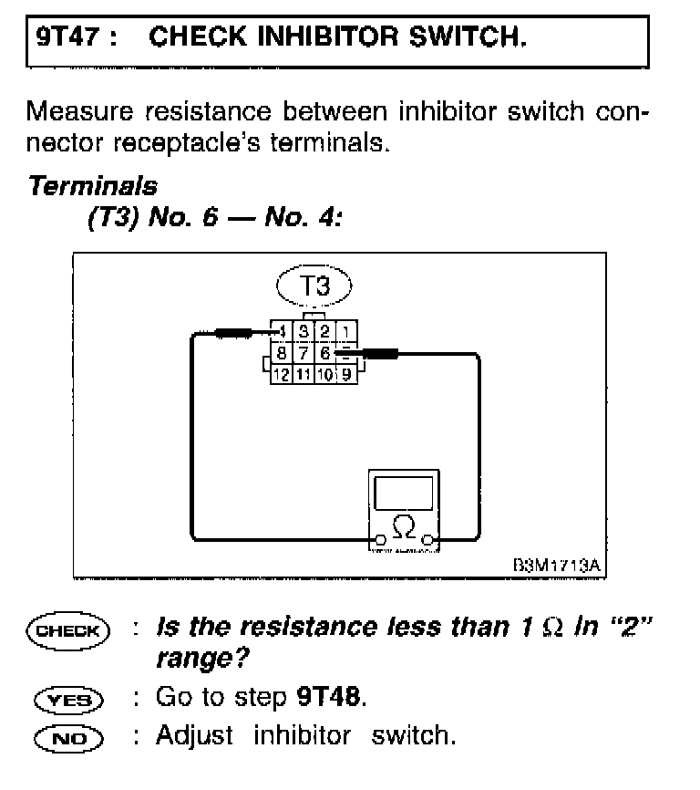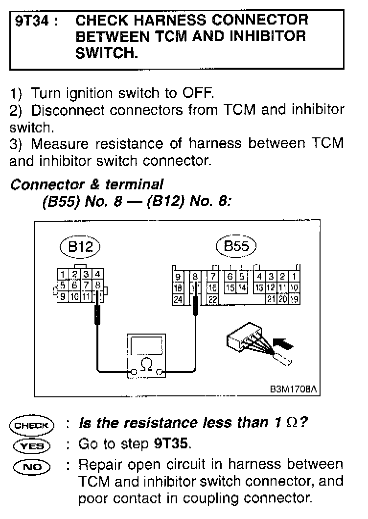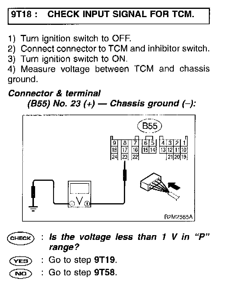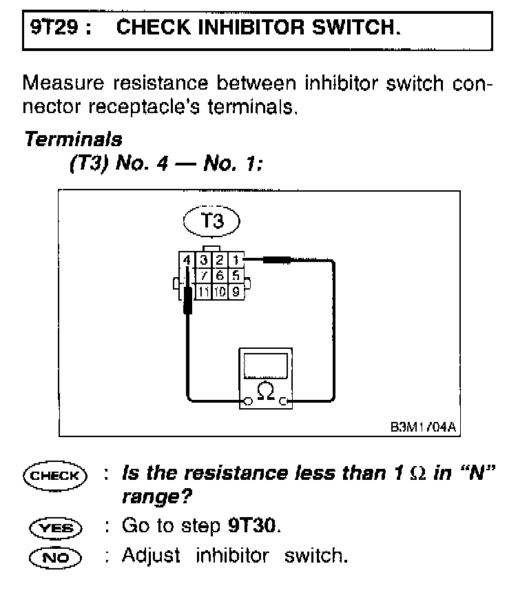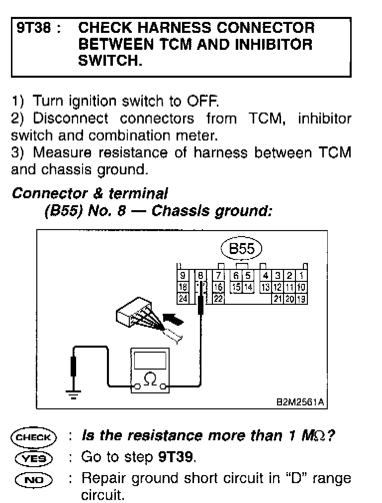 9T15: CHECK HARNESS CONNECTOR BETWEEN INHIBITOR SWITCH AND CHASSIS GROUND.