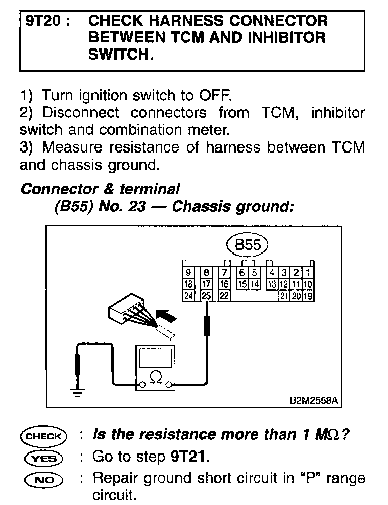 9T20: CHECK HARNESS CONNECTOR BETWEEN TCM AND INHIBITOR SWITCH.
