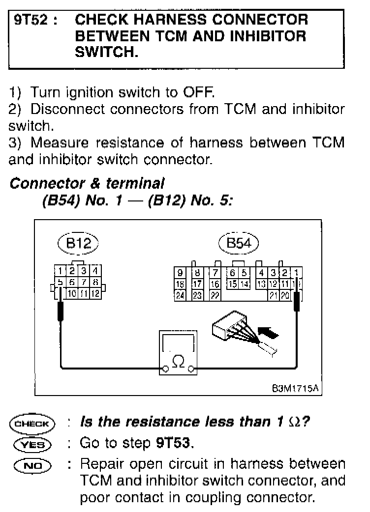 9T52: CHECK HARNESS CONNECTOR BETWEEN TCM AND INHIBITOR SWITCH.