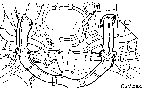 4. Remove front exhaust pipe. Disconnect oxygen sensor connector, and remove front and center exhaust pipe.
