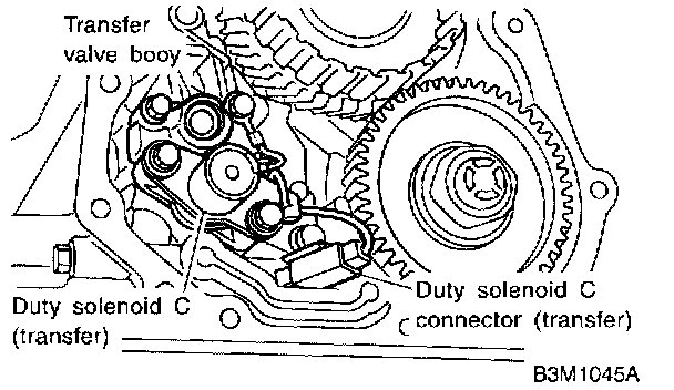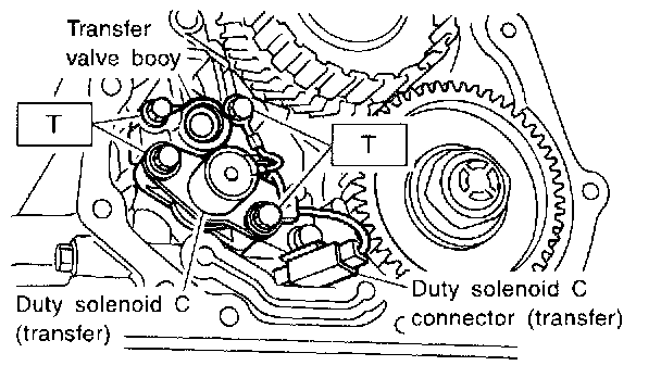 11. Remove duty solenoid C (transfer) and transfer valve body.