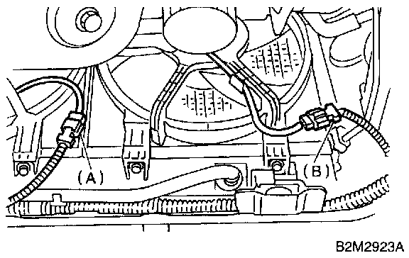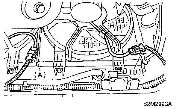 5) Disconnect connectors from radiator main fan (A) and sub fan (B) motors.