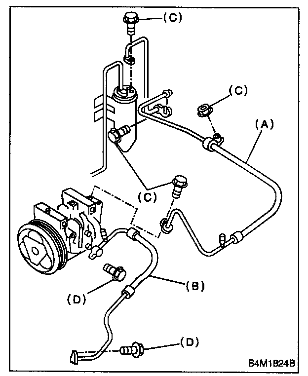 CAUTION: Plug the opening to prevent foreign matter from getting in. Remove hose attaching bolt (D).