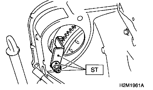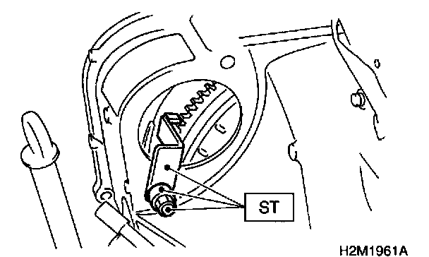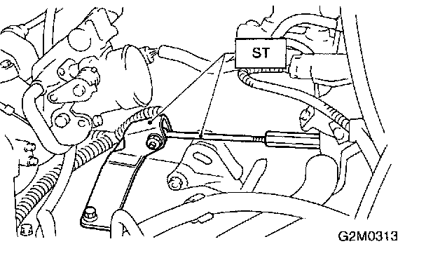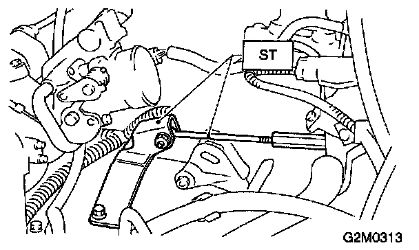 1. Install ST to torque converter clutch case. (A/T vehicles) ST 498277200 STOPPER SET