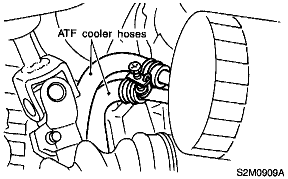 17. Disconnect ATF cooler hoses from pipes of transmission side, and remove ATF level gauge guide. (A/T vehicles)