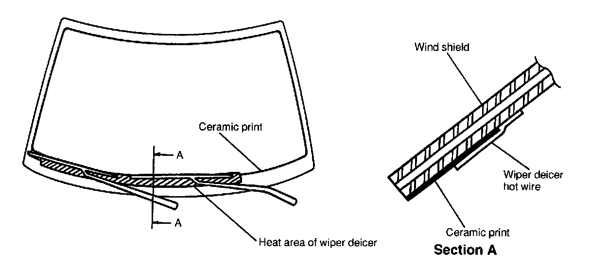 The wiper deicer system is activated when its wiper deicer switch is turned ON and heats with a heater wire the lower part of the windshield to melt the ice that blocks the wiper blades. The system turns off automatically in 15 minutes after the wiper deicer switch is turned ON.