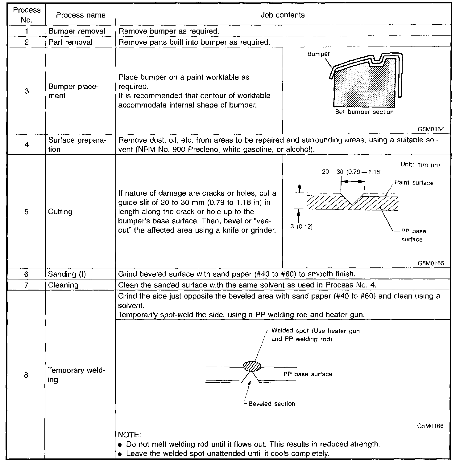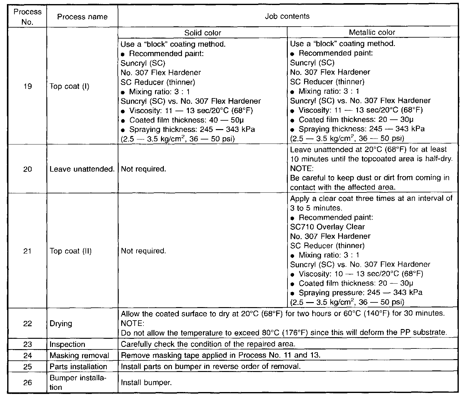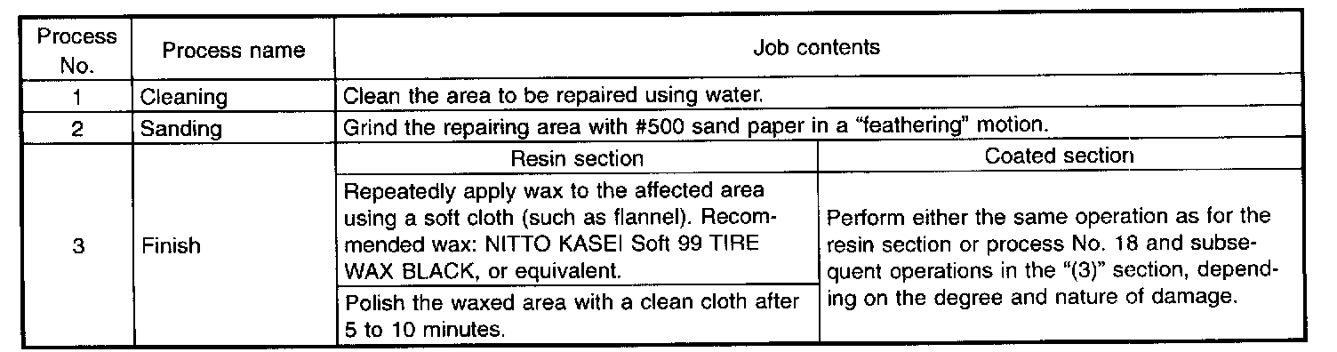 All PP bumpers are provided with a grained surface, and if the surface is damaged, it cannot normally be restored to its former condition. Damage limited to shallow scratches that cause only a change in the lustre of the base material or coating, can be almost fully restored. Before repairing a damaged area, explain this point to the customer and get an understanding about the matter. Repair methods are outlined below, based on a classification of the extent of damage.MINOR DAMAGE CAUSING ONLY A CHANGE IN THE LUSTRE OF THE BUMPER DUE TO A LIGHT TOUCH