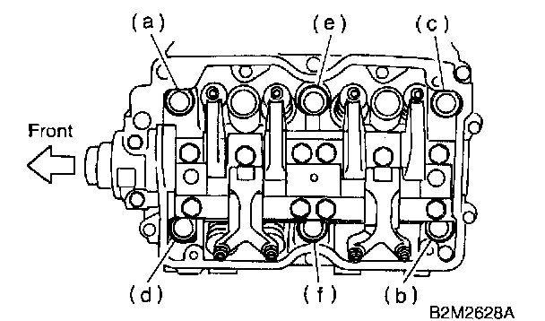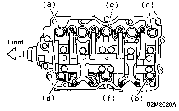 CAUTION: Leave bolts (a) and (c) engaged by three or four threads to prevent cylinder head from falling.