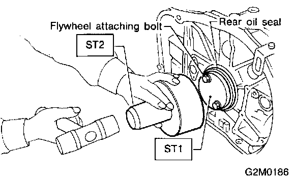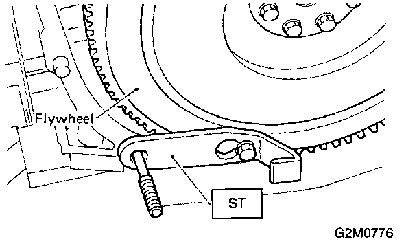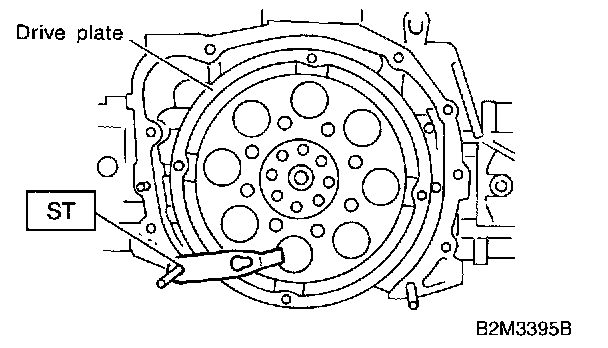 11) Remove flywheel (M/T vehicles only) or drive plate (A/T vehicles only). Using ST, lock crankshaft.