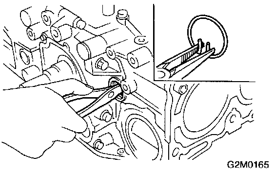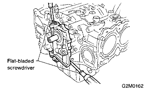 15) Remove oil pump from cylinder block. Use a flat-bladed screwdriver as shown in figure when removing oil pump.