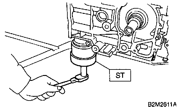 b) Using ST1, turn crankshaft so that #1 and #2 connecting rods are set at bottom dead center.