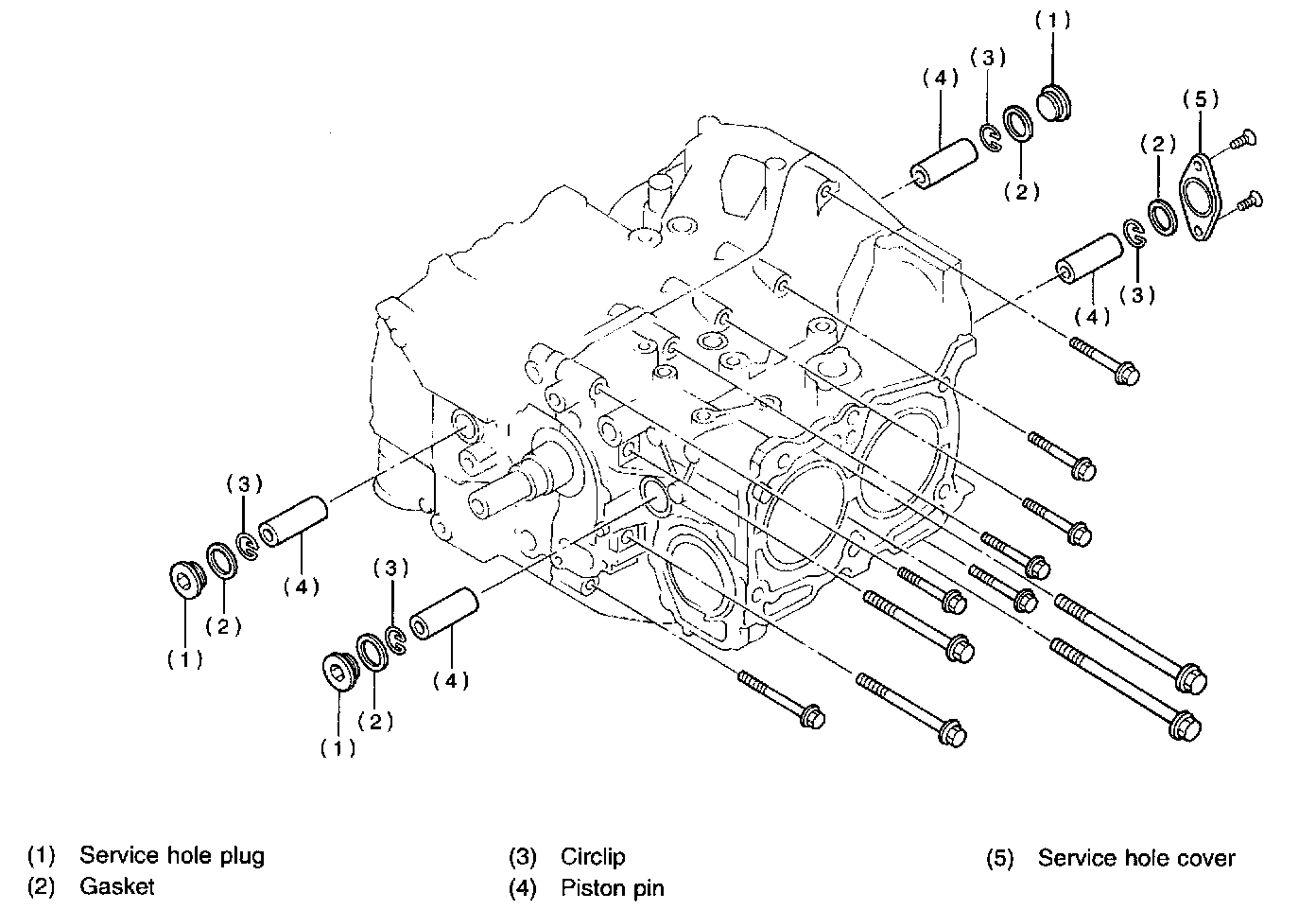 2) Rotate crankshaft to bring #1 and #2 pistons to bottom dead center position, then remove piston circlip through service hole of #1 and #2 cylinders.