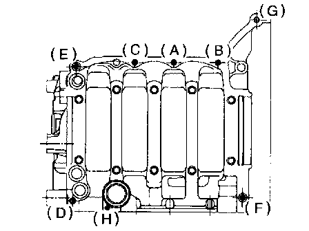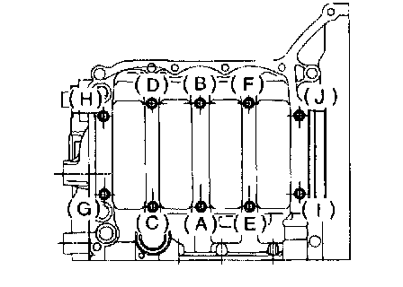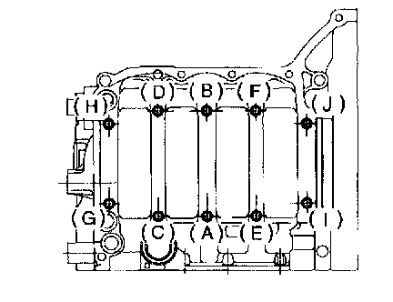 5) Tighten 10 mm cylinder block connecting bolts in alphabetical sequence.