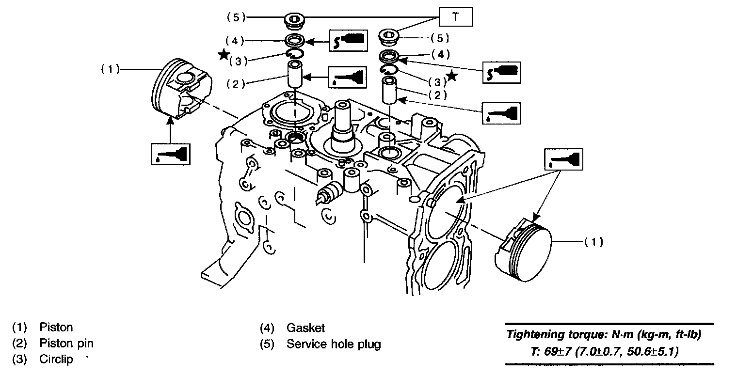 b) Apply a coat of engine oil to piston pin and insert piston pin into piston and connecting rod through service hole.