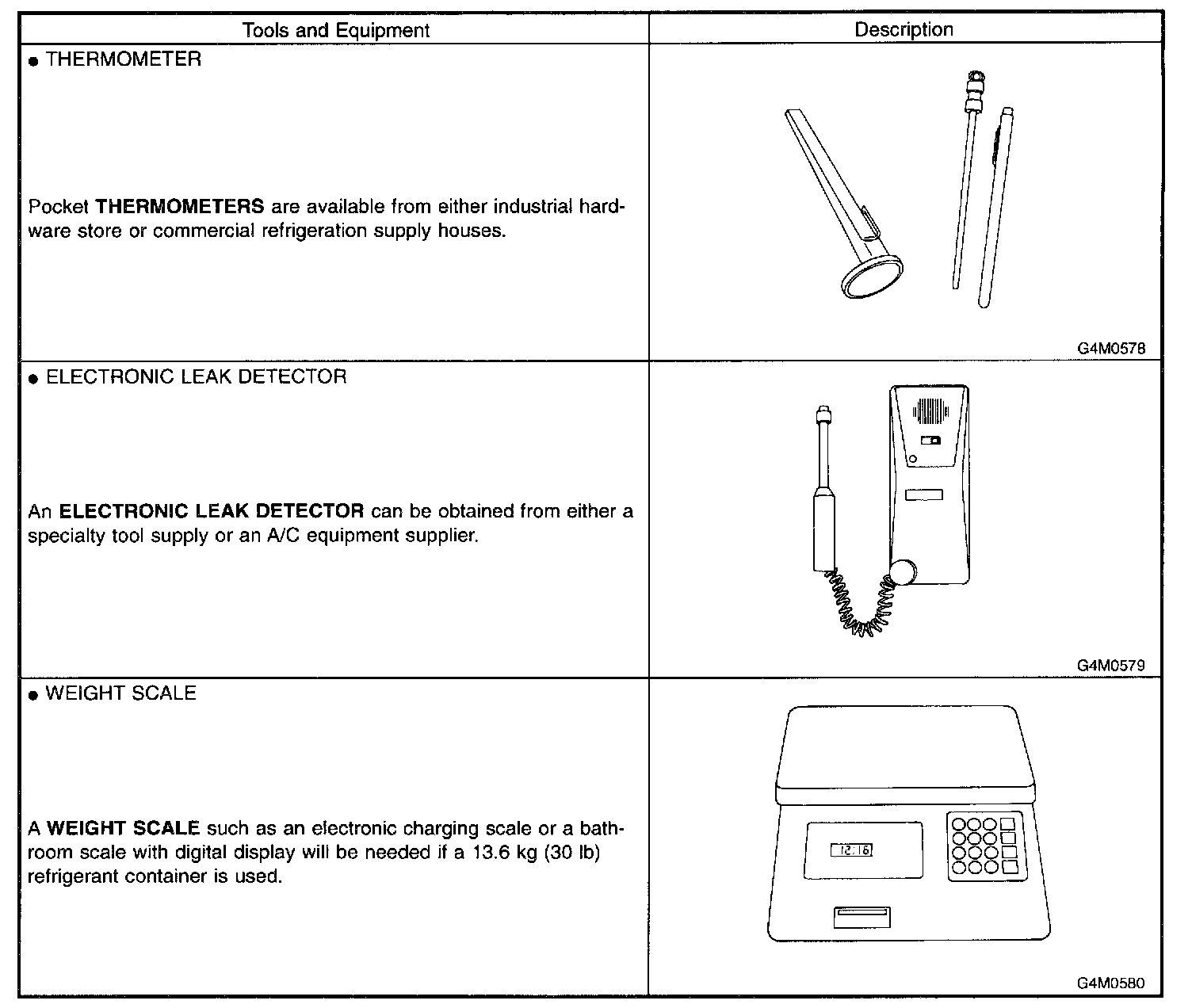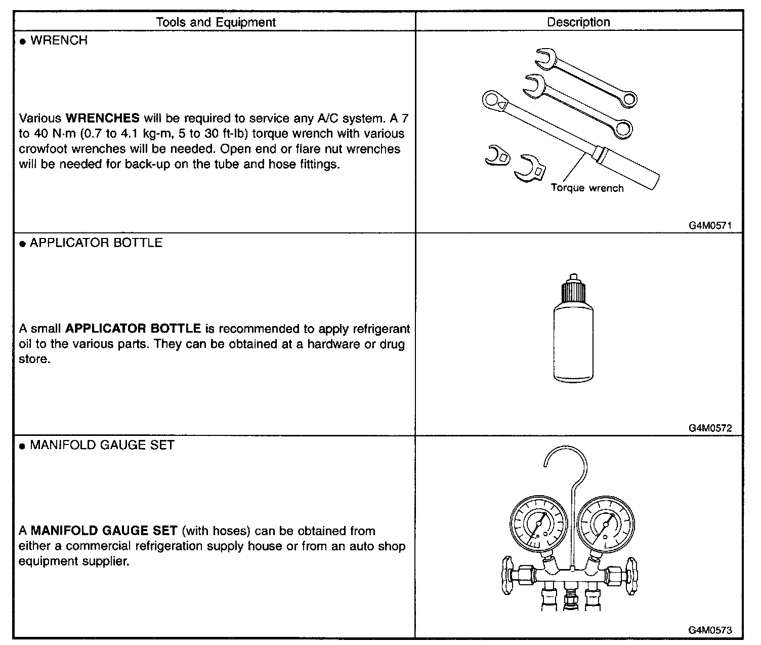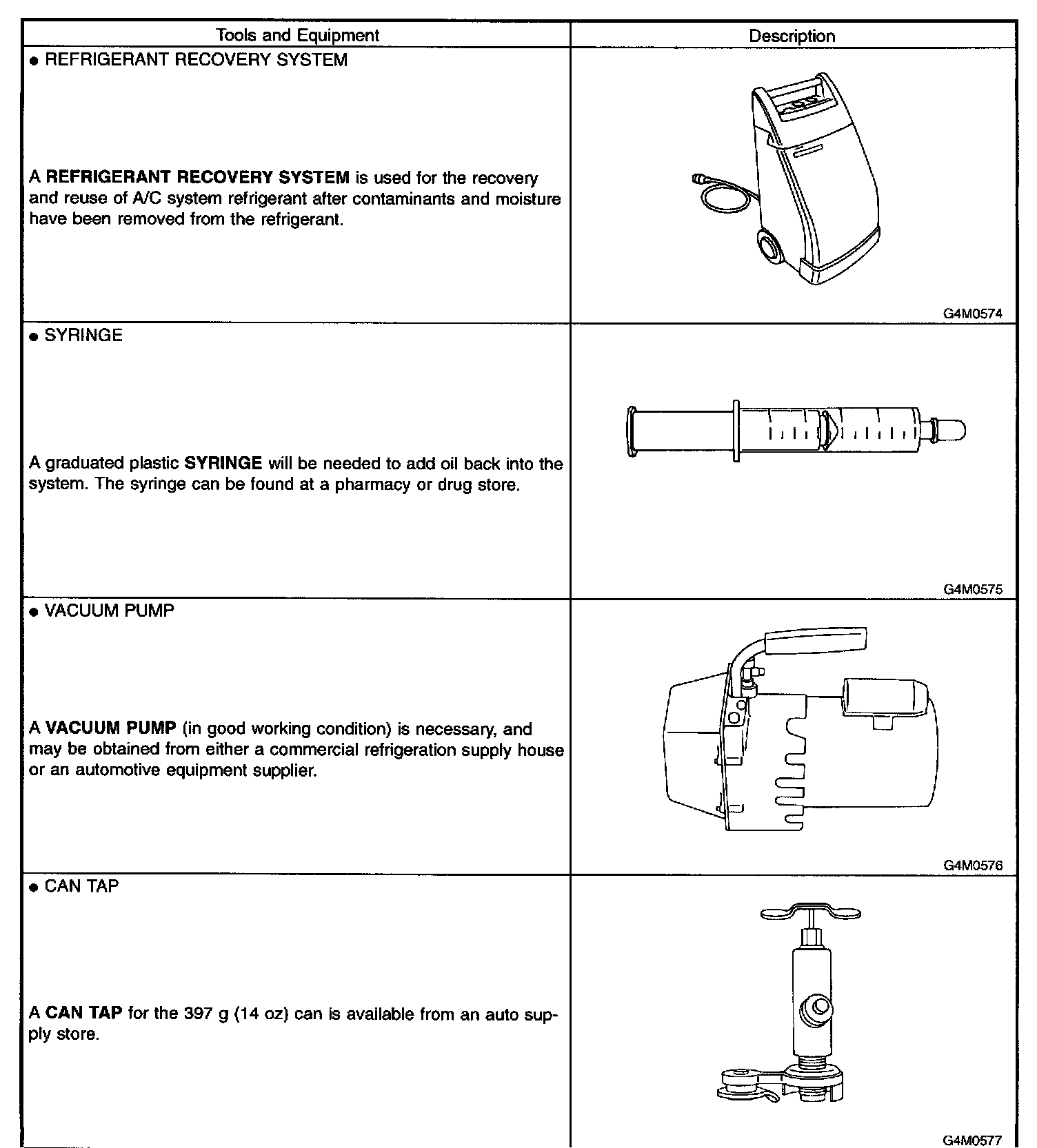 The following section provides information about the tools and equipment that will be necessary to properly service the A/C system.
