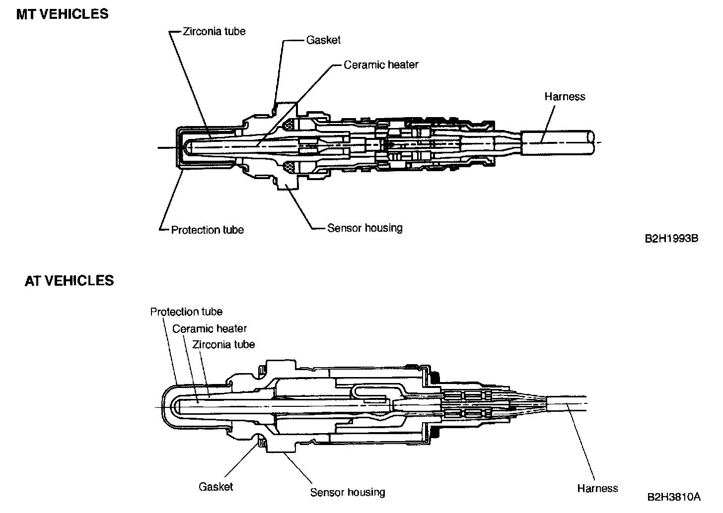 - The rear oxygen sensor has a zirconia tube (ceramic) which generates voltage if there is a difference in oxygen concentration between the inside and outside of the tube. Platinum is coated on the inside and outside of the zirconia tube for the purpose of catalysis and electrode provision. The sensor housing is grounded to the exhaust pipe, and the inside is connected to the ECM through the harness.