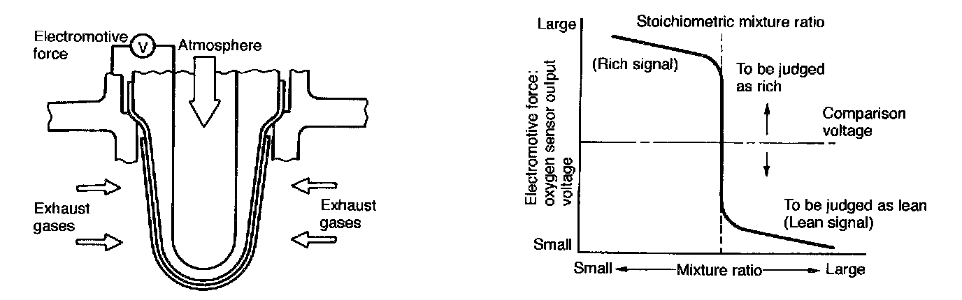 - When a lean air-fuel mixture is burnt in the cylinder, oxygen remains in the exhaust gases even after the catalytic action, and this results in a small difference in the oxygen concentration. The electromotive force is very small.
