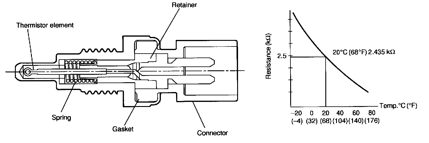 - The engine coolant temperature sensor is located on the engine coolant pipe which is made of aluminum alloy. Its thermistor changes resistance with respect to temperature. A engine coolant temperature signal converted into resistance is transmitted to the ECM to control the amount of fuel injection, ignition timing, purge control solenoid valve, etc.
