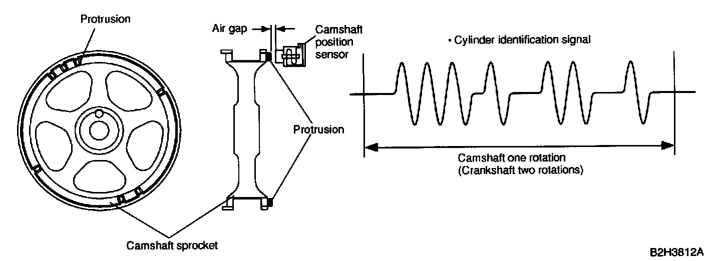 - It is designed so that the ECM accurately reads the number of pulses which occur when protrusions provided on the back of the left hand camshaft-drive sprocket cross the sensor. Internal construction and the basic operating principle of the camshaft position sensor are similar to those of the crankshaft position sensor. A total of seven protrusions (one each at two locations, two at one location and three at one location) are arranged in four equal parts of the sprocket, as shown.