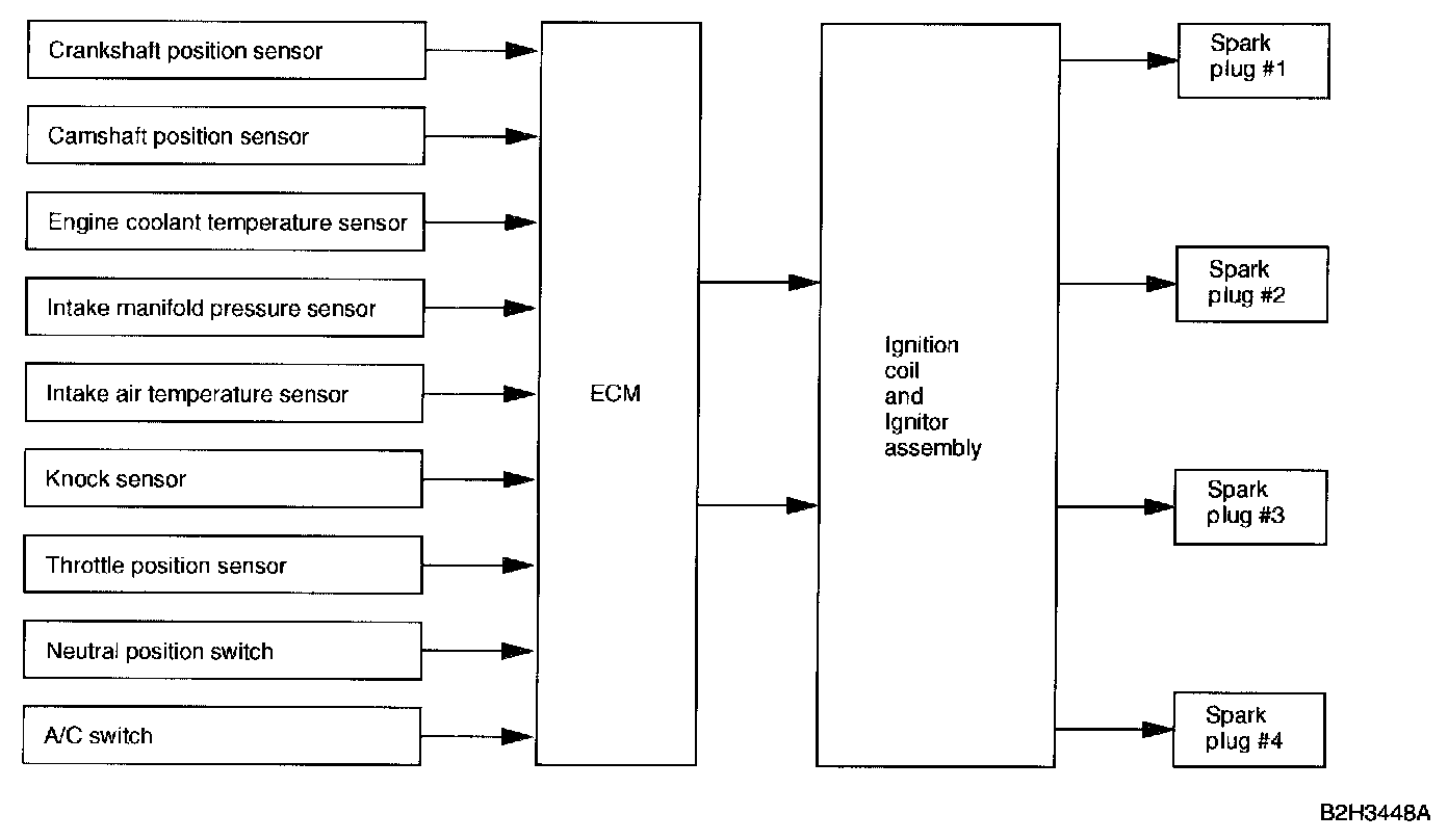 The ECM determines the optimal ignition timing according to signals sent from various sensors (which monitor the operating conditions of the engine), and sends a signal to the ignitor.