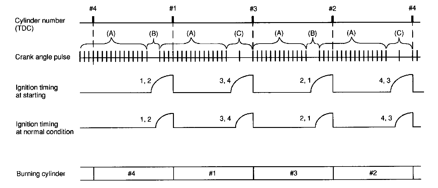 - The ECM judges that the No.1 and No.2 cylinders are at TDC when detecting the range (B), and that the No.3 and No.4 cylinders are at TDC when detecting the range (C).
