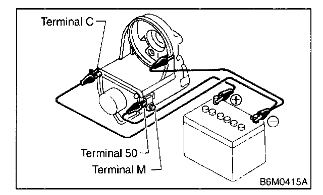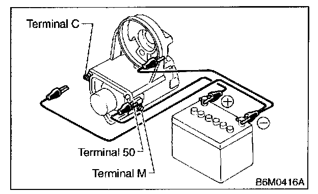 Connect two battery negative leads onto magnetic switch body and terminal C respectively. Then connect battery positive lead onto terminal 50. Pinion should extend when lead connections are made.