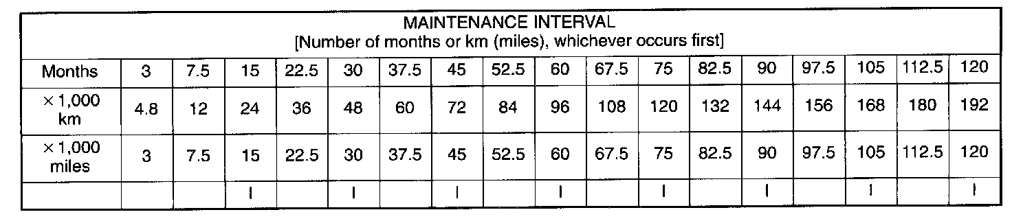 Inspect every 50,000 km (30,000 miles) or 24 months, whichever occurs first.