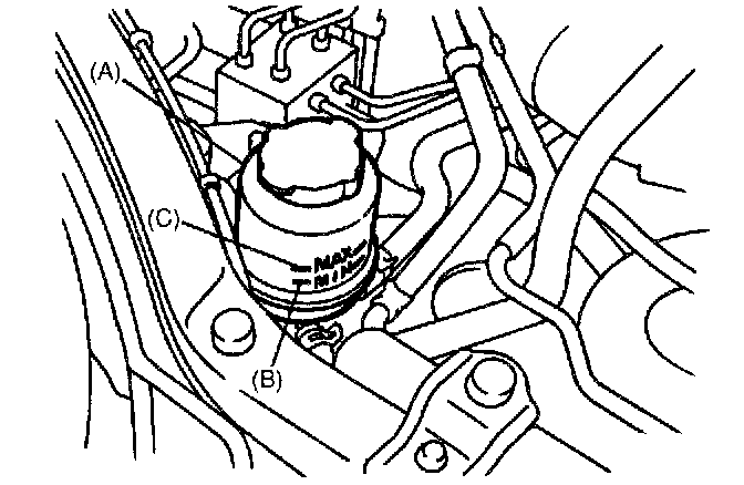 2. Check the fluid level using the scale on the outside of the reservoir tank (A). If the level is below "MIN" (B), add fluid to bring it up to "MAX" (C).