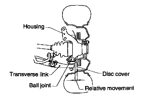 2. Next, grasp bottom of tire and move it in and out. If relative movement is observed between brake disc cover and end of transverse link, ball joint may be excessively worn.
