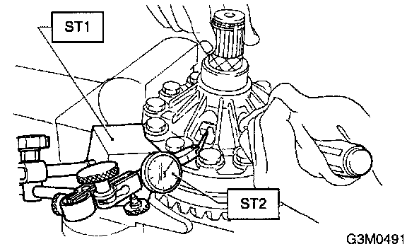 Measure the gear backlash with Service Tool ST1 and ST2, and insert ST2 through the access window of the case.