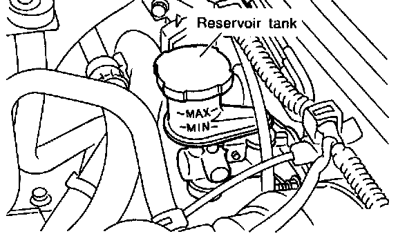 1. Check fluid level using a scale on outside of reservoir tank. If the level is below "MIN", add brake fluid to bring it up to "MAX".