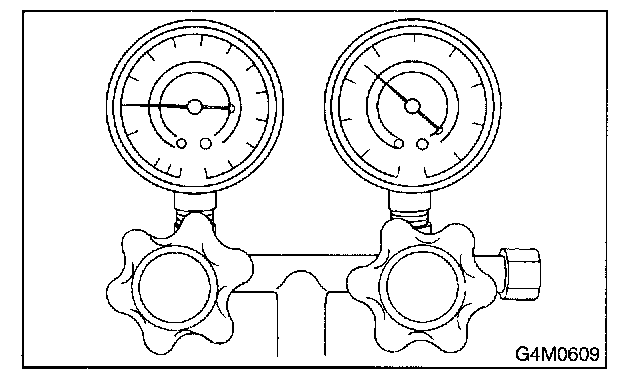 With gauges connected to the A/C system, operate the A/C and confirm that the high side pressure is above 690 kPa (7.03 kg/sq.cm, 100 psi). If not, evacuate and charge the system before leak checking.