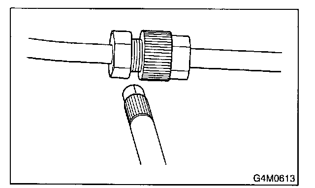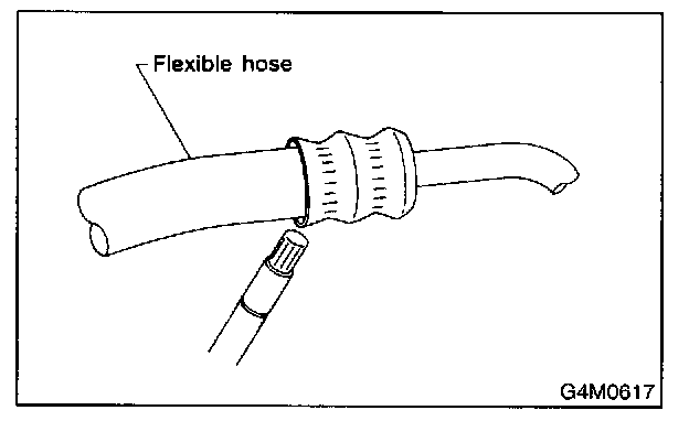 1. Visually inspect the rubber portions of the flexible hoses for cracking. Probe the rubber section, including the ends of any insulators or protectors which may cover sections of the rubber hose, and near the ends where the rubber meets the metal collar.