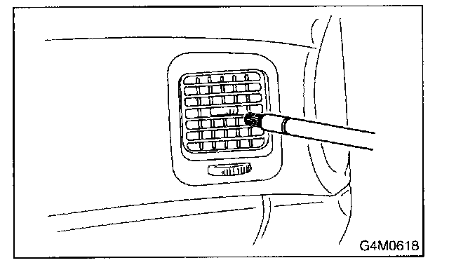 3. With the ignition key in the "ACC" position, run the blower on high speed for 1 minute, then turn the blower off. Place the probe in the center instrument panel vent, and turn the blower on low speed for 1 to 2 seconds, then turn the blower off. Leave the probe in the vent for at least 10 seconds.