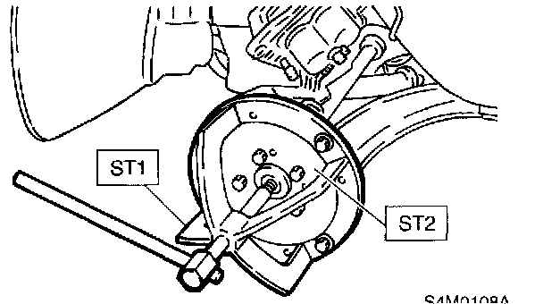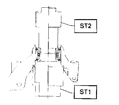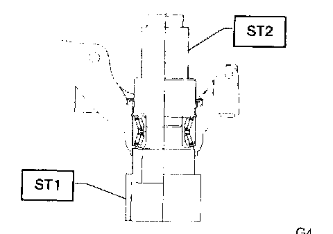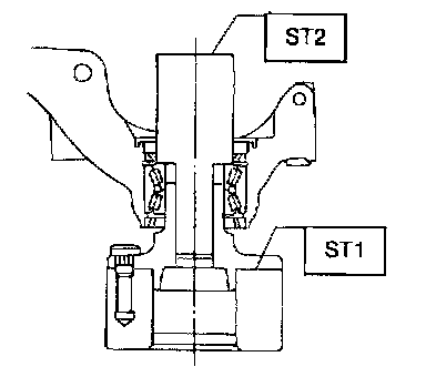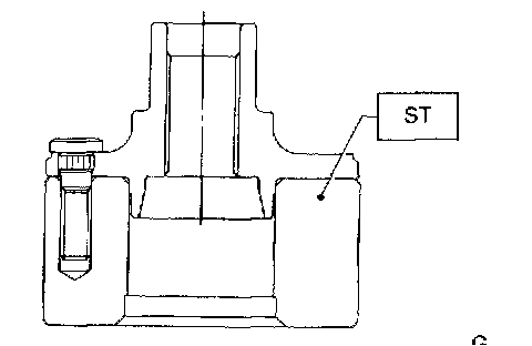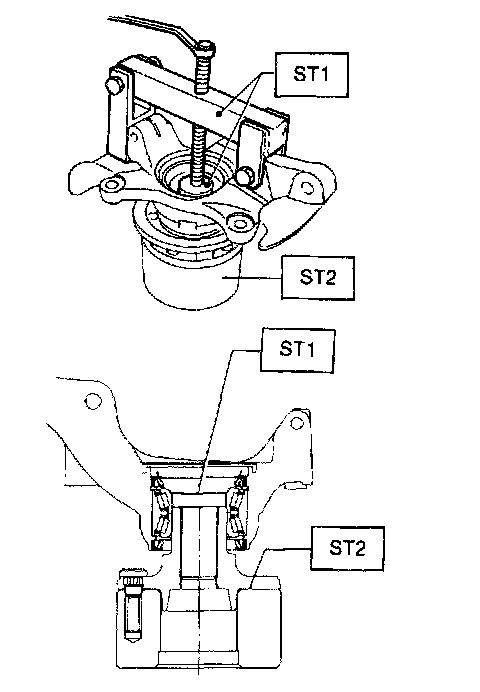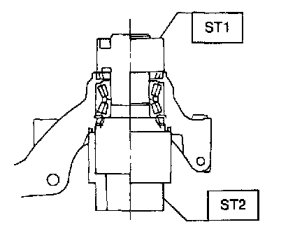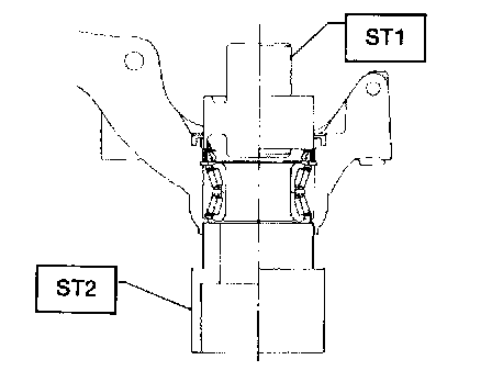 8. Using ST1 and ST2, press outer oil seal until it contacts the bottom of housing.