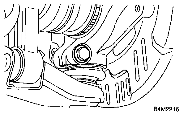 6. Remove disc brake caliper from housing, and suspend it from strut using a wire.