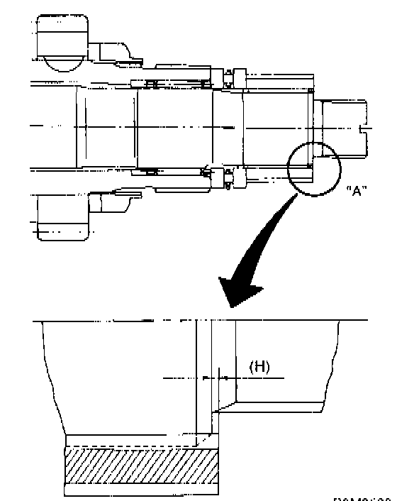 1. After completing the preceding steps 1) through 3), select adjusting washer No. 1 so that dimension (H) is zero through visual check. Position washer (18.3 x 30 x 4) and lock washer (18 x 30 x 2) and install lock nut (18 x 13.5).