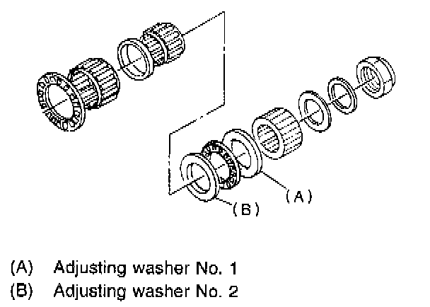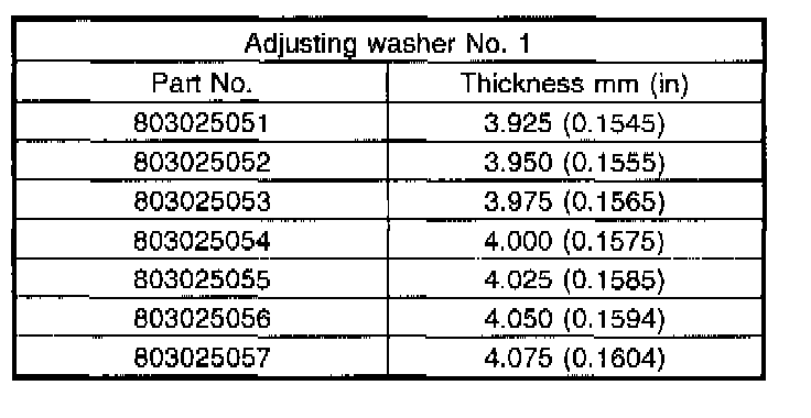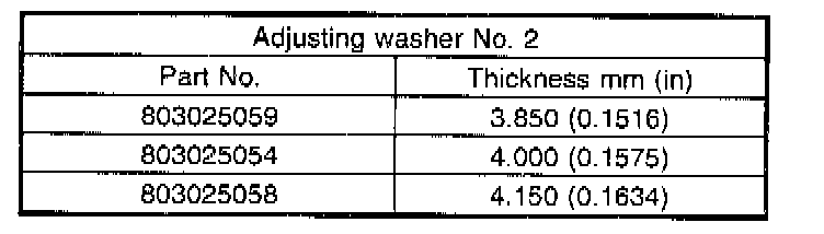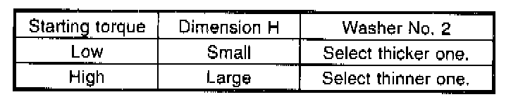 5. If specified starting torque range cannot be obtained when a No. 1 adjusting washer is used, then select a suitable No. 2 adjusting washer from those listed in the following table. Repeat steps 1) through 4) to adjust starting torque.