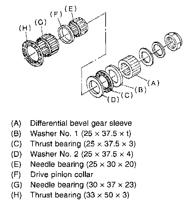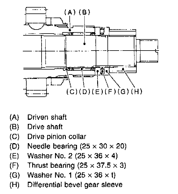 2. Withdraw drive pinion from driven shaft. Remove differential bevel gear sleeve, adjusting washer No. 1, adjusting washer No. 2, thrust bearing, needle bearing, drive pinion collar, needle bearing and thrust bearing.