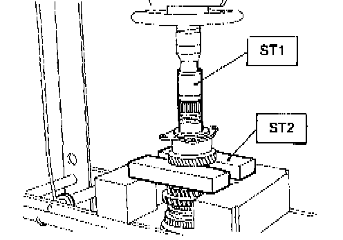 7. Remove 1st driven gear, 2nd gear bushing, gear and hub using ST1 and ST2.