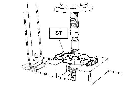 3. Install 2nd driven gear bushing onto driven shaft using ST1, ST2 and press.