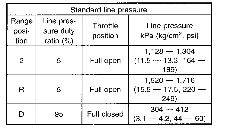 ^ Before measuring line pressure, apply both foot and parking brakes with all wheels chocked (Same as for "stall" test conditions).