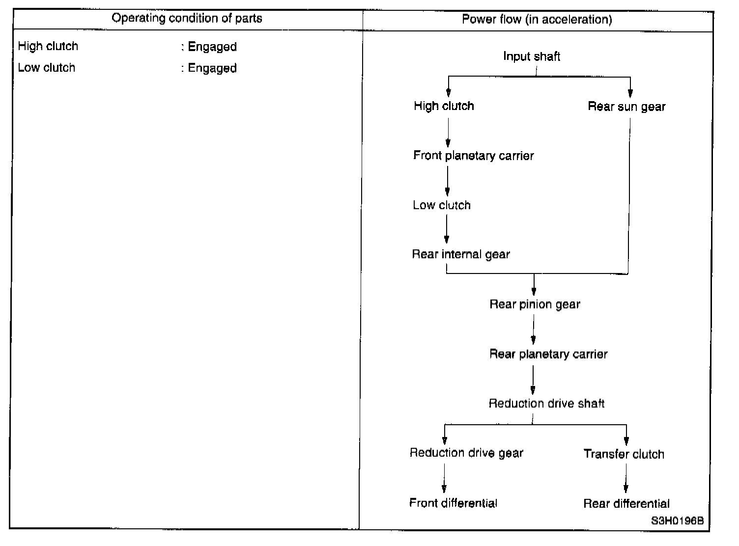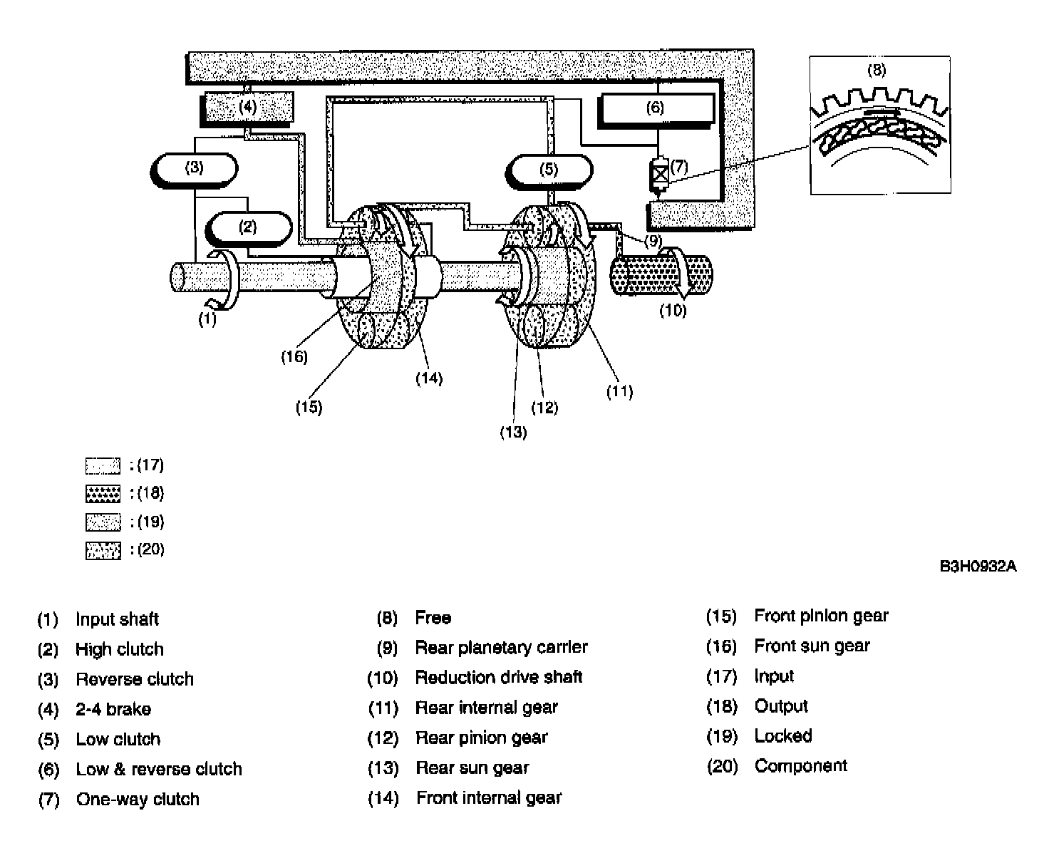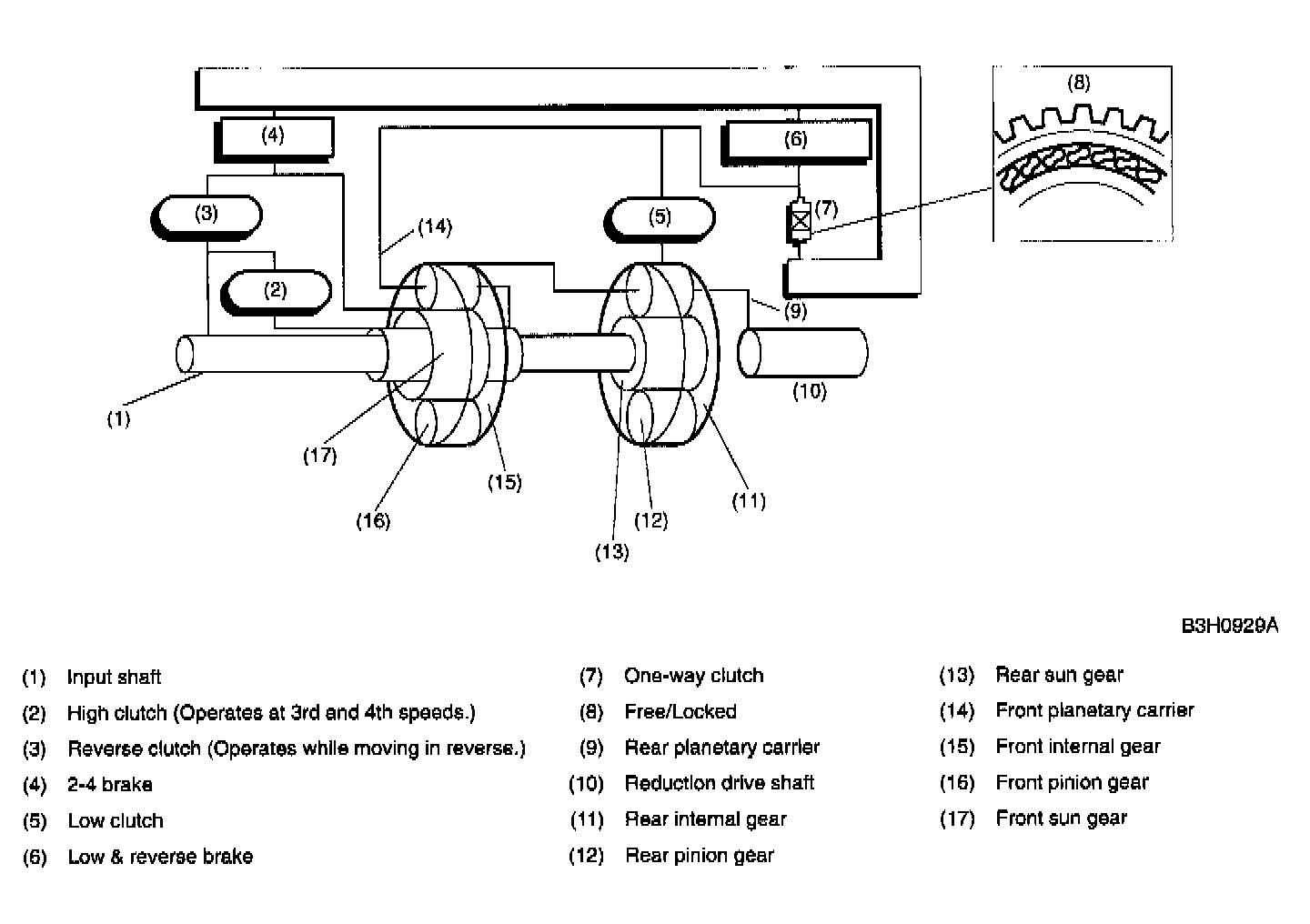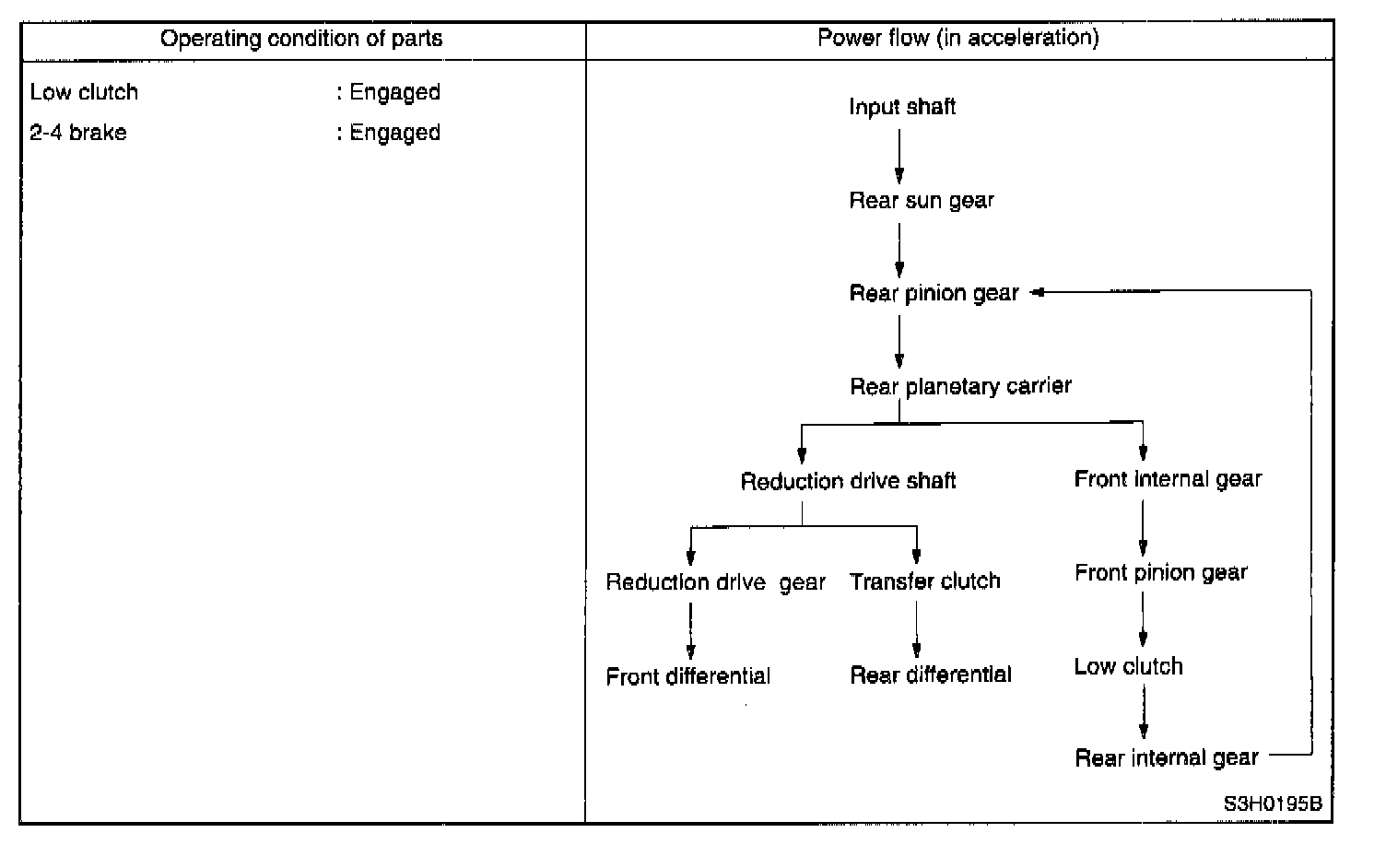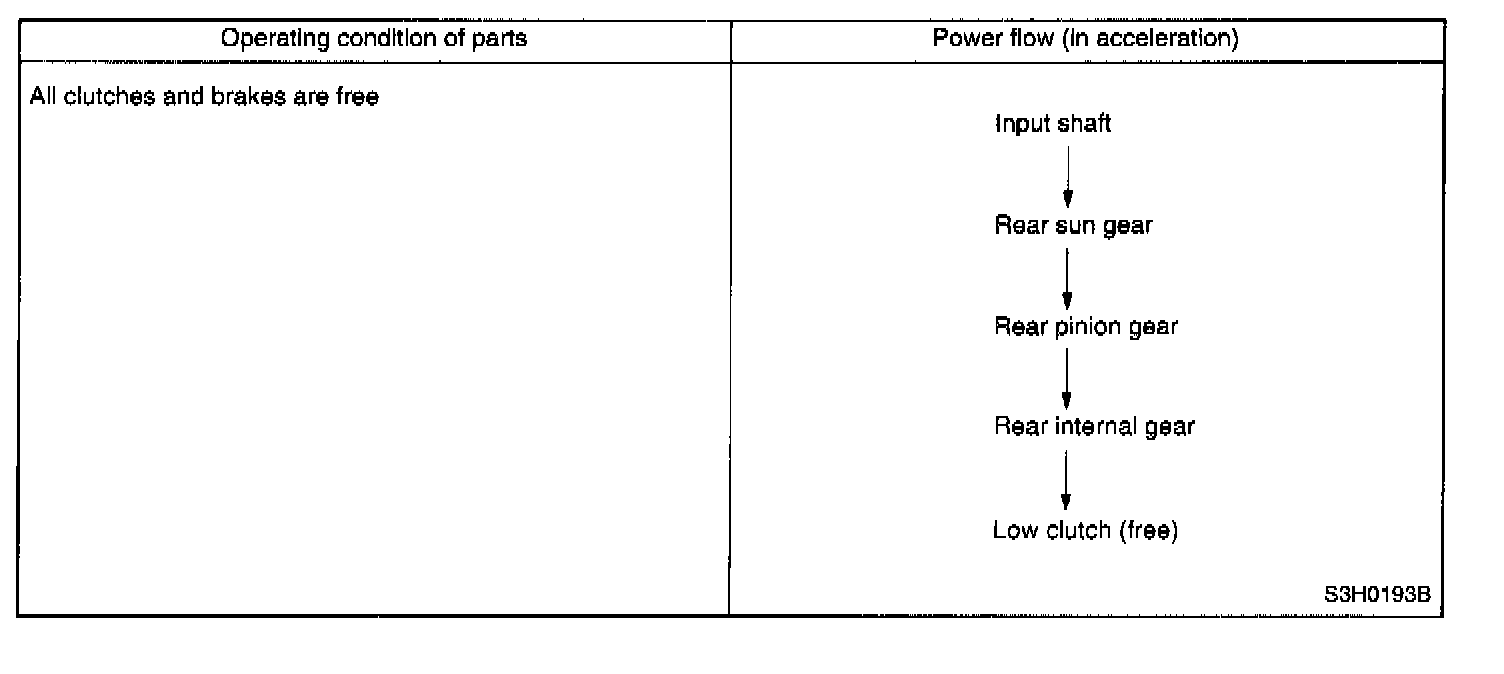 The one-way clutch is free because the low clutch rotates clockwise. Since the driving power is transmitted without being affected by the one-way clutch, the back driving force from the reduction drive shaft is transmitted to the input shaft, thus the engine braking effect being available.